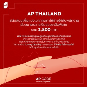 - เอพี ไทยแลนด์ เดินหน้าเคียงข้างดูแลคุณภาพชีวิตพนักงาน สนับสนุนเงินช่วยเหลือพิเศษเดือนเมษายน รวม 2,800 บาท ร่วมเป็นส่วนหนึ่งเพื่อแบ่งเบาภาระค่าใช้จ่ายby All Around TH