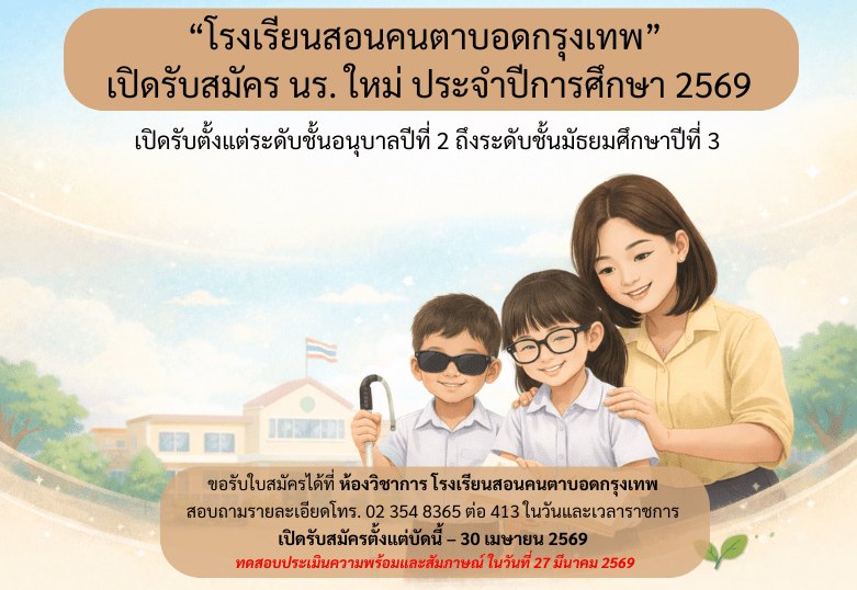 “โรงเรียนสอนคนตาบอดกรุงเทพ” เปิดรับสมัครนักเรียนใหม่ ประจำปีการศึกษา 2569 ตั้งแต่ระดับชั้นอนุบาลปีที่ 2 ถึงระดับชั้นมัธยมศึกษาปีที่ 3